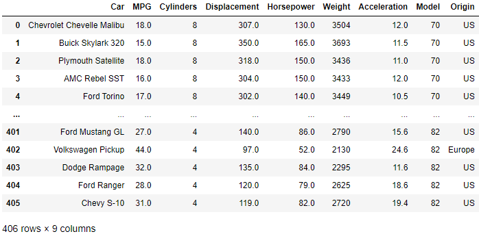 You may notice that the number of columns in the DataFrame has been reduced by 1 when calling 'Car' as the index. This is an important behaviour to be aware of — the index does not form a part of the DataFrame values (i.e. it is not a column of data in the DataFrame) but is still accessible through the index