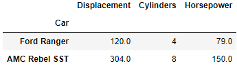 df.loc[['Ford Ranger','AMC Rebel SST'],['Displacement','Cylinders','Horsepower']]