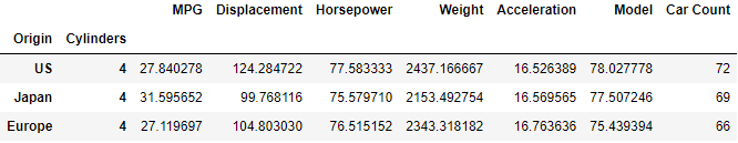 DataFrame that we have created it may be easiest to compare cars like-for-like by showing only the cars with equal numbers of cylinders from each region. This would make for an easier comparison.