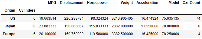 One nuance of our dataset not adequately captured in the pivot table created above is that there are a lot of 8 cylinder US cars which may be skewing the results somewhat. There are no Japanese or European 8 cylinder cars in the dataset so it would be useful to perform a more like-for-like comparison and compare the 4 and 6 cylinder cars from each region directly. We can do this be generating a MultiIndex pivot table and then extracting the data we require.